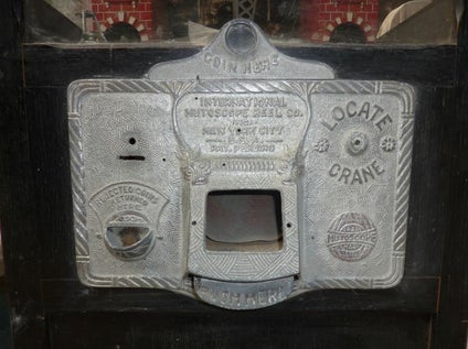 Voorplaat van de Mutoscope versie uit London. De betreffende kraan is eveneens afkomstig uit Engeland, en stond daar lange tijd in de buurt van de zee opgeslagen.