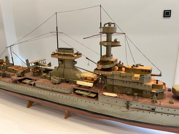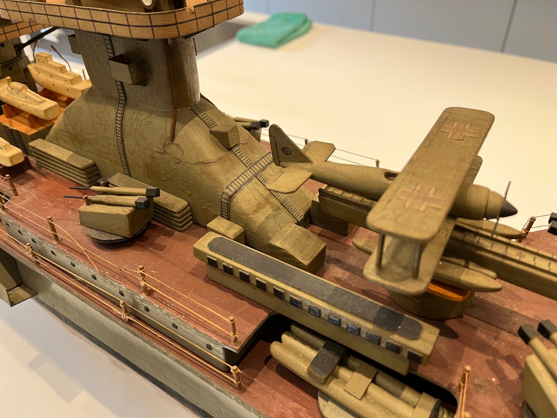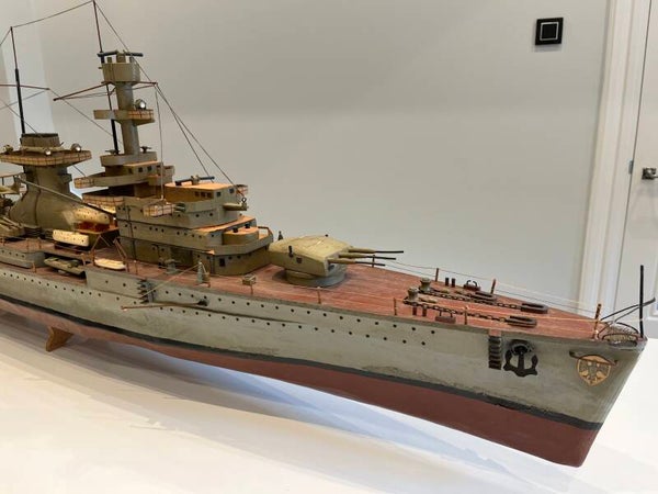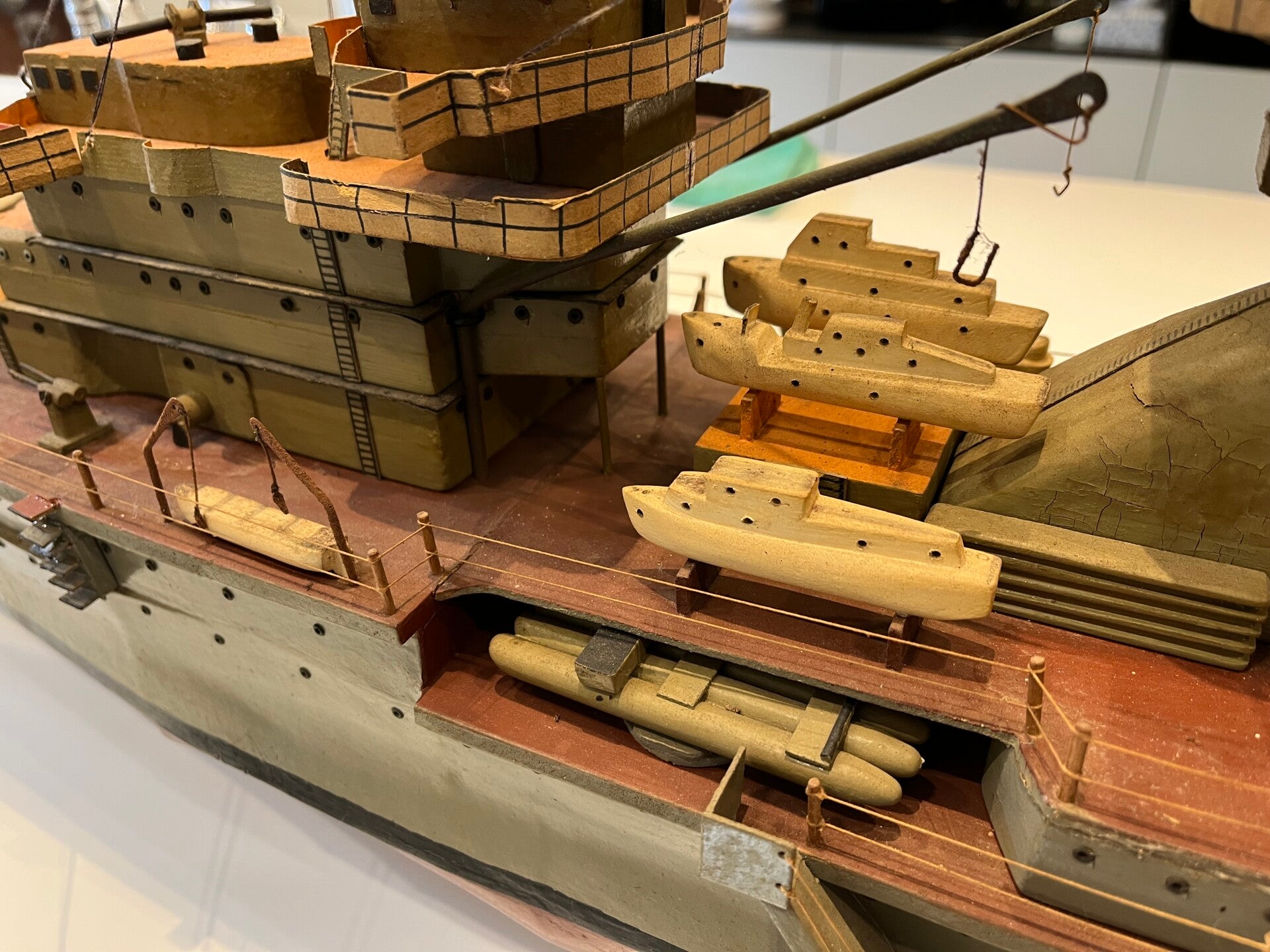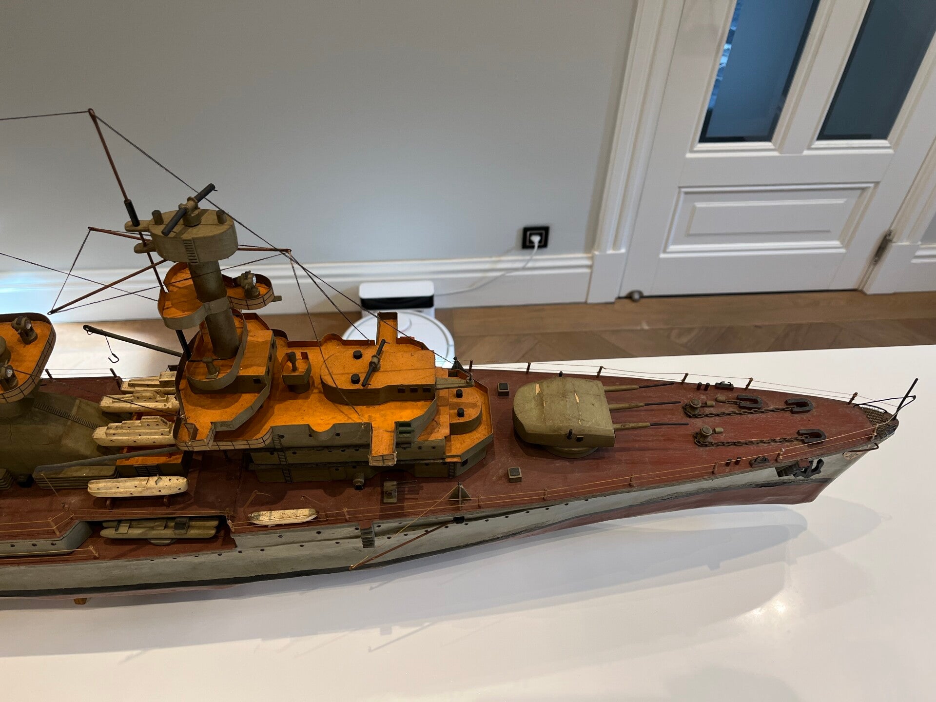 180!! cm lang. Volledig gebouwd als houten skeletbouw en bekleed met papier/karton, zelfde als veel vliegtuigen.