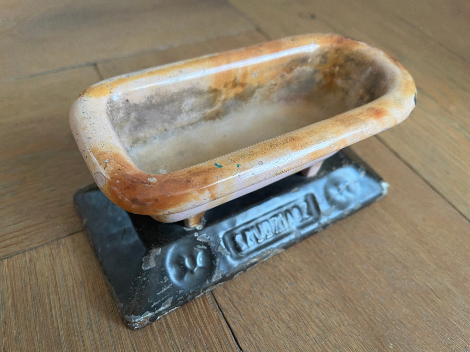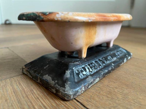 Voor oorlogse badkuip reclame object, sales model. 15 x 7,5 cm groot. Roze emaille badkuip op emaille voet.Herzfeld & Victorius S.A.