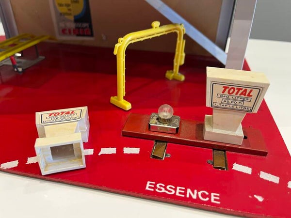 40x27 cm groot, 23 cm hoog. Zeer mooie staat met autolift, wasplaats, showroom en tankstation. Benzinepompen zijn verlicht als er getankt wordt. Grote Total reclamemast is ooit gebroken geweest en gelijmd.