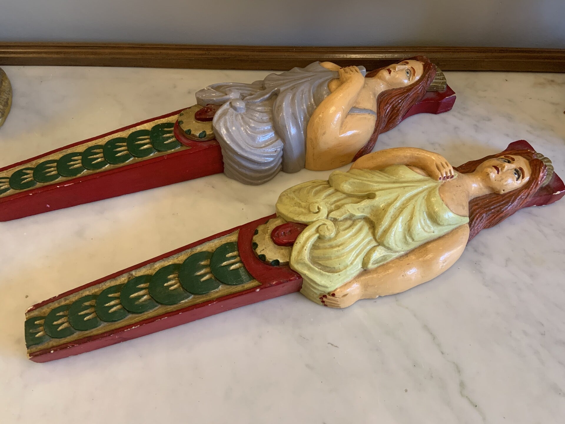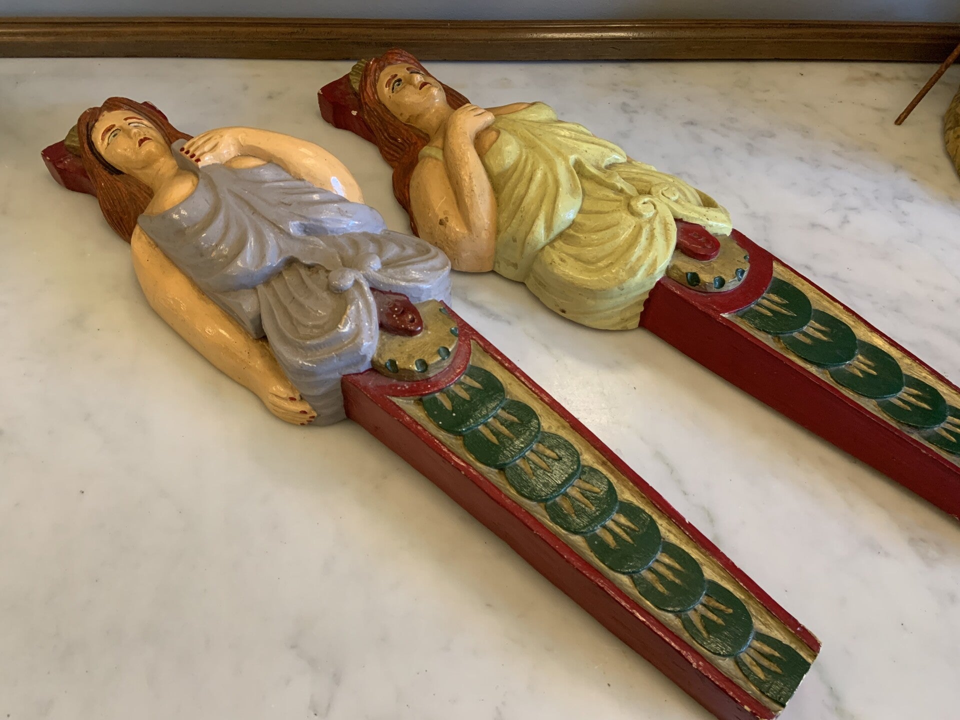 2 stuks vrouwelijk figuur, gesneden uit hout.Oorspronkelijk afkomstig uit een spiegeltent van de kermis.