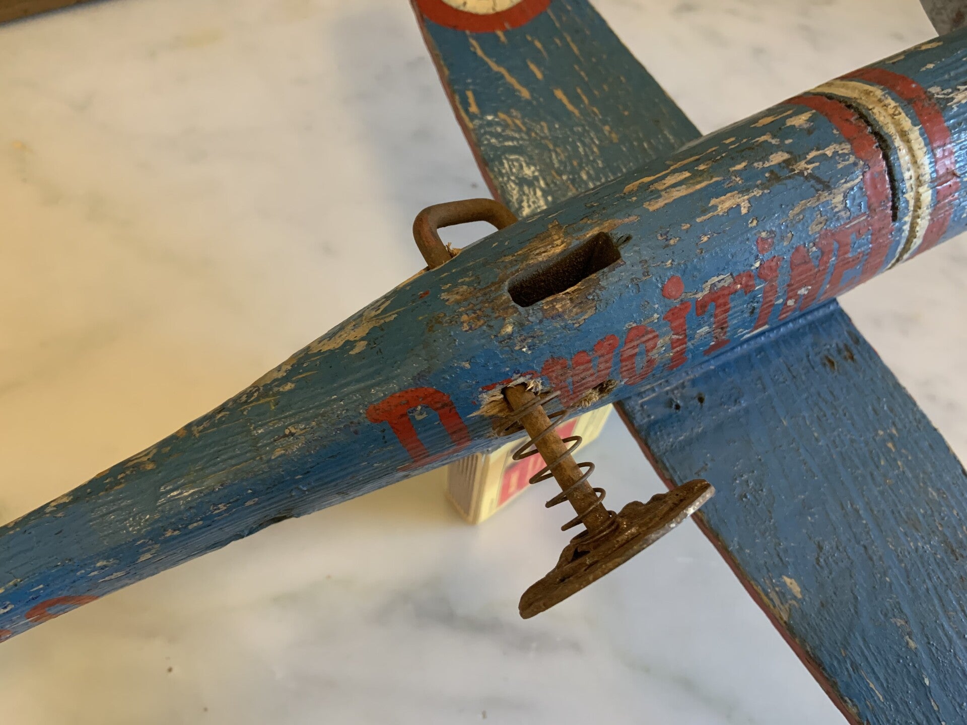 Afkomstig uit een ballengooitent, waar er meerdere stonden opgesteld. Bij een goed gemikte worp werd de target ingedrukt, daardoor viel een houten bom welke aan het vliegtuig was bevestigd. Die vervolgens 'insloeg' op een puntentelling.