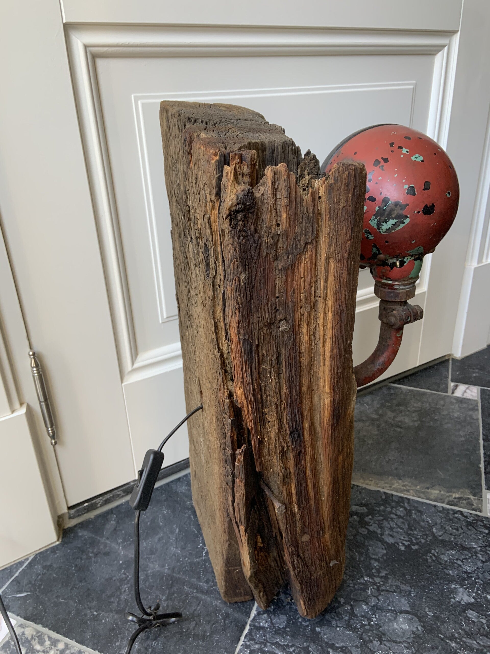Aparte lamp voor in huis.Oude traktorlamp met mooie patina gemonteerd op een verweerde houten blok.150 euro