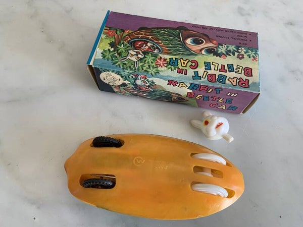 Made in Hong Kong, begin 70er jaren.Rabbit in Beetle Car met frictie aandrijving.In nieuwstaat met originele doos, het hoofdje van het konijn beweegt op en neer tijdens het rijden.55 euro