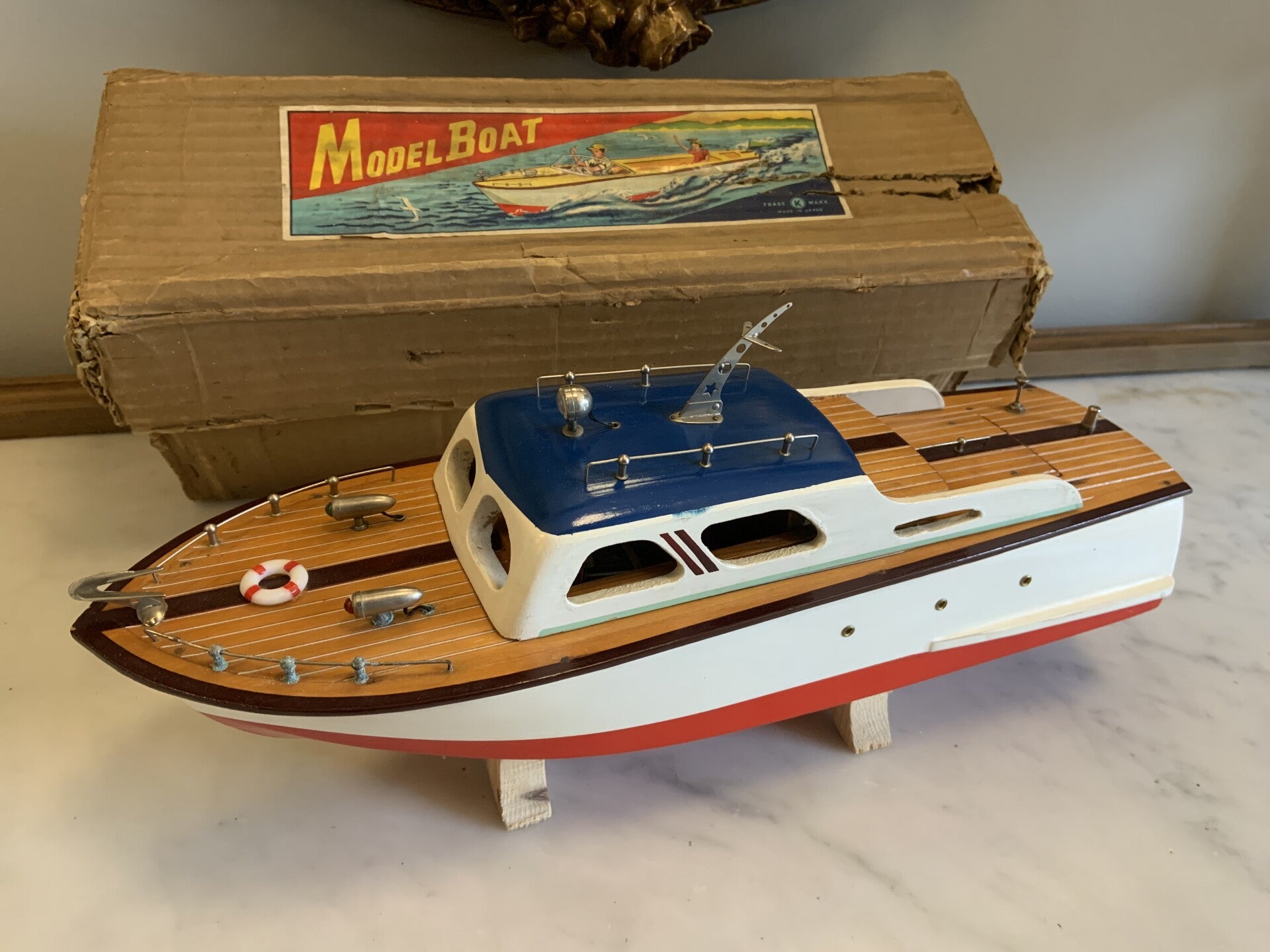 Kanto, Made in Japan.Volledig houten boot met werkende motor en verlichting. Zeer goede staat in de originele doos, 40 cm groot.Begin 50er jaren.300 euro