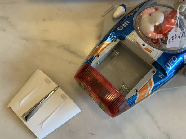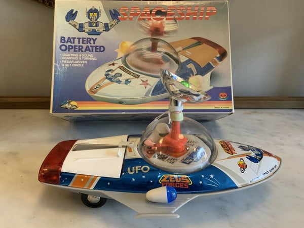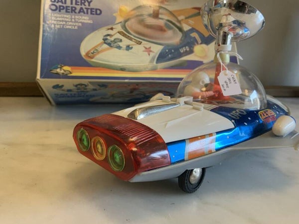 Blikken met plastiek spaceship, als nieuw in de originele doos. Compleet en zonder beschadigingen.