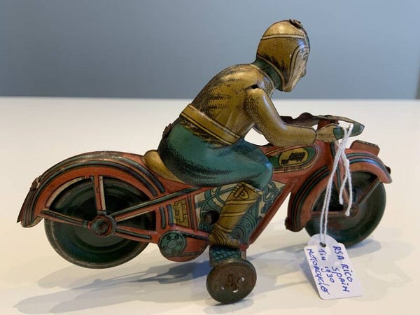 Vooroorlogse blikken motorfiets met uurwerk (helaas niet werkend), op de tank gemerkt met R.S.A.16 cm groot