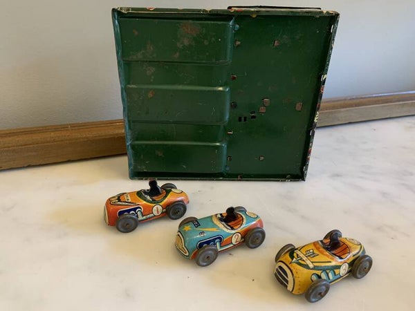 Leuke blikken garage van 15x13 groot met mechaniek om 3 autootjes mee te laten racen. De autootjes worden door een druk op de knop weg geschoten en dan is het kijken welke auto het verst komt.
