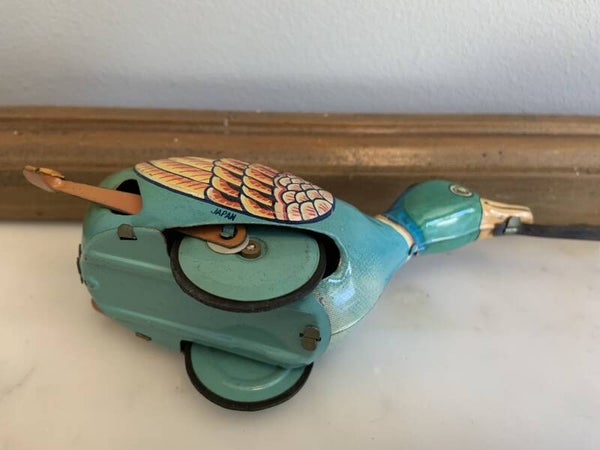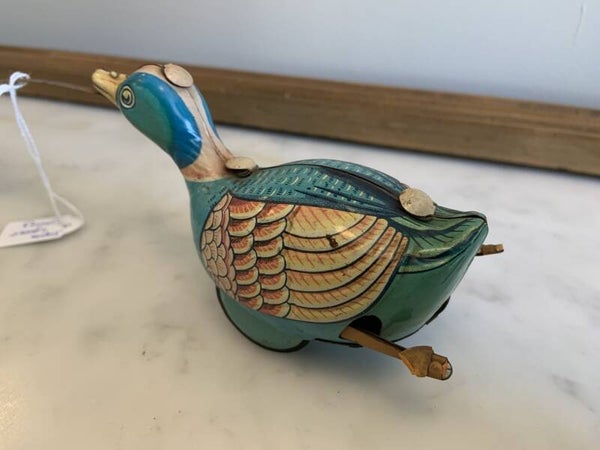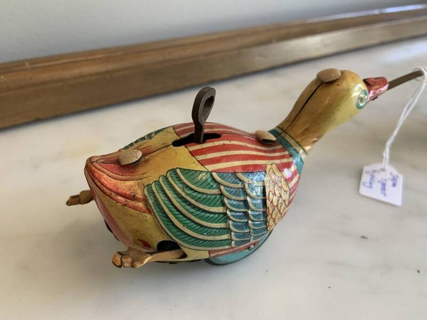2 ganzen die vechten om een worm. Werkende opwindmechaniek. Ganzen gaan op en neer en daarbij spartelen de pootjes.