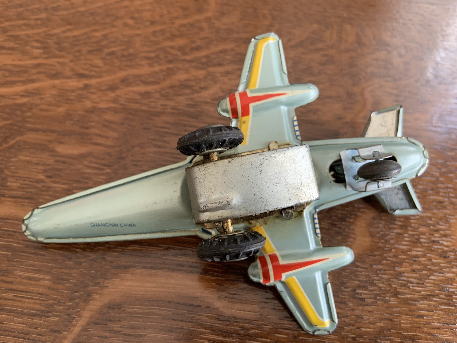 Kleine jet van 12 cm groot met werkende frictie aandrijving. Gemerkt met Shanghai China.