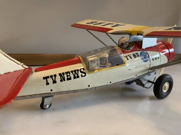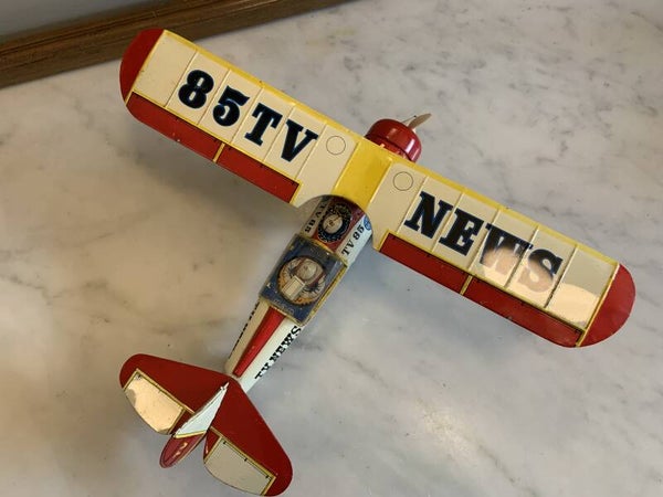 Groot TV News vliegtuig met werkende frictie, draaiende propellor en bewegende camaraman.