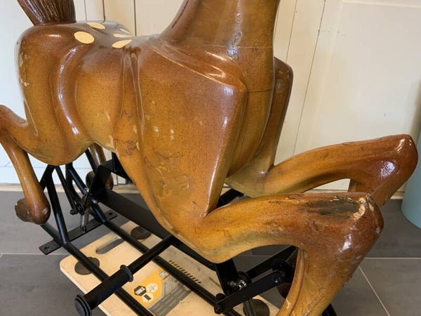 Aangeboden Bambi van de welbekende Disney film, heeft nog de originele lak, maar is hier en daar bijgwerkt en heeft enkele kleine beschadigingen. Het onderstel is eens eerder gerestaureerd en ziet er goed uit.