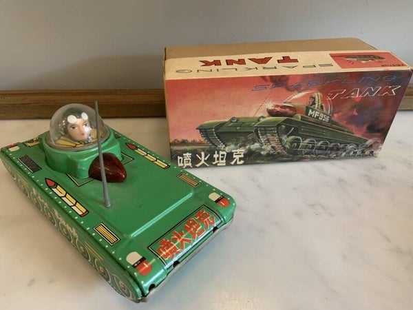 Blikken space tank met werkende frictie aandrijving en fonkelend vuursteentje. Tank zelf zie je vrij vel, maar niet met het oude originele doosje. 22 cm groot.
