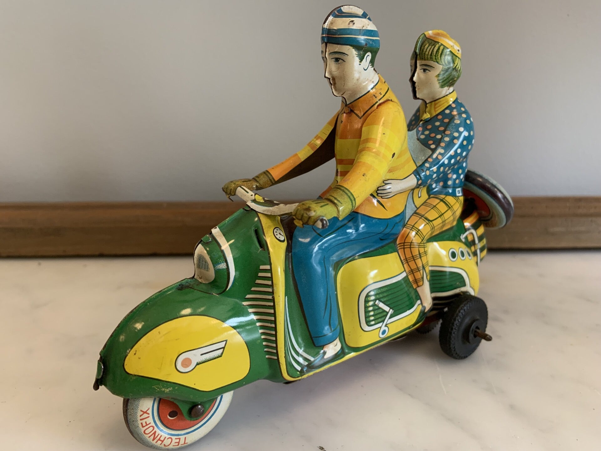 Blikken scooter met frictie aandrijving. Model waar de vrouw een broek met schots motief en polkadot trui aanheeft ipv gestreepte broek met blauwe trui.