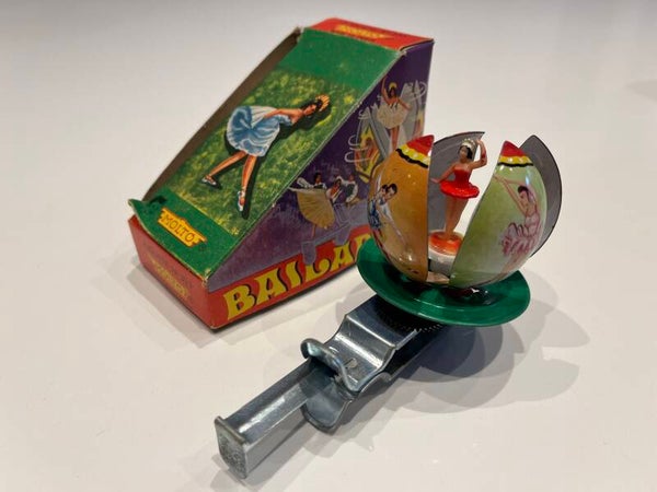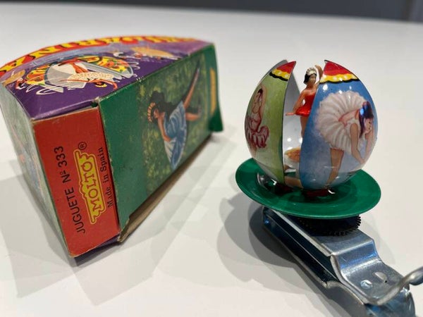 Bailarina no. 333. 11 cm groot, blikken speeltje met opengaande lotusbloem met daarin een danseres. Zeer mooie afbeeldingen, als nieuw met origineel doosje.
